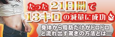 このダイエット法は、身体から脂肪だけをドロドロ流し出し体重を激減させることができます!簡単な2つのルールを守って生活するだけです。それでもグングンやせるのです。信じられないでしょう!?毎日毎日、自動で1キロずつ痩せていくんですよ!結局、一ヶ月で15キロのダイエットに成功したのです。私の体験をもとに、驚きのダイエット教材が完成しました。